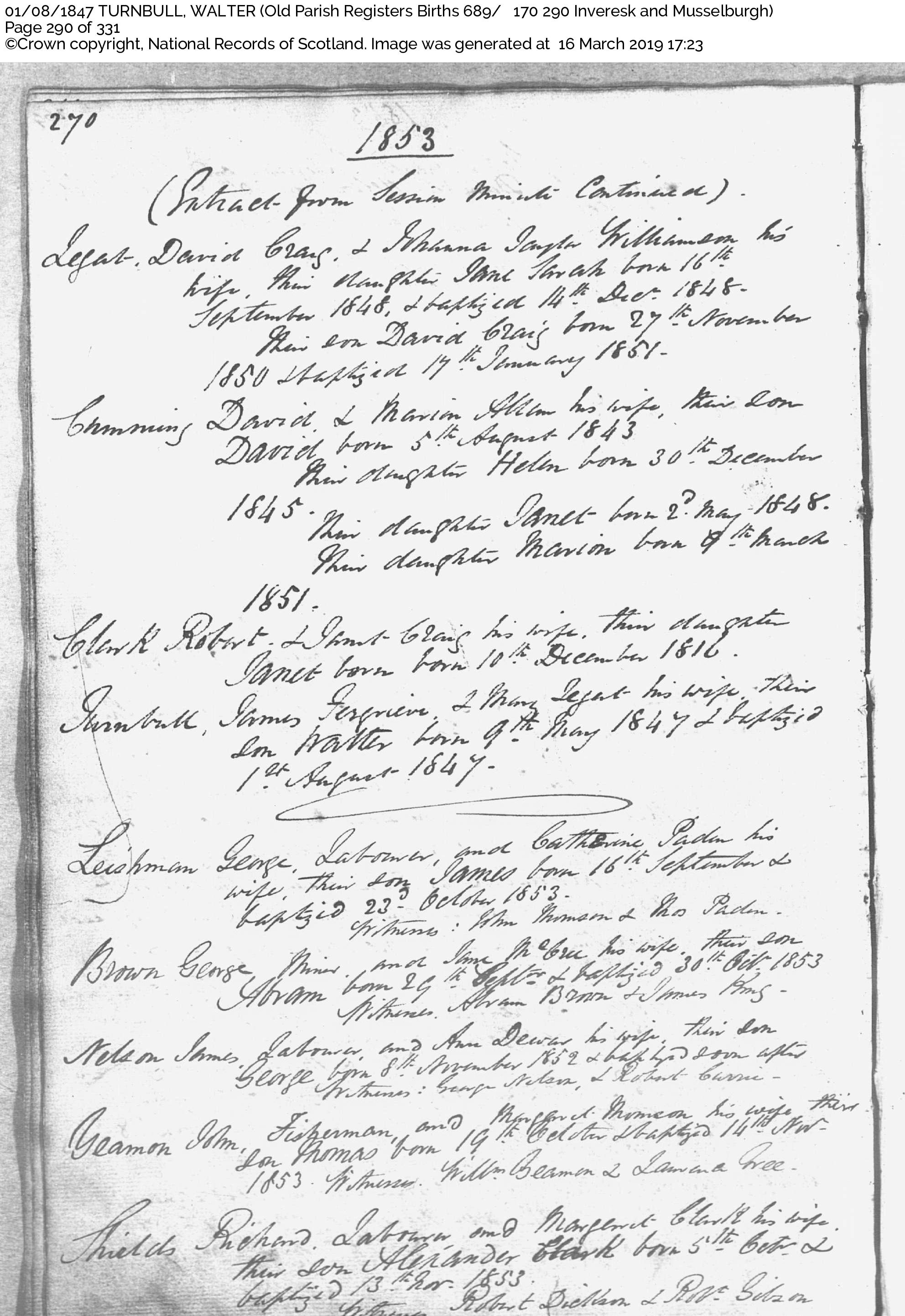 | Residence | Walter Turnbull lived Relationship: Great Grandchild in Inveresk, Midlothian, Scotland, in 1851.6 |