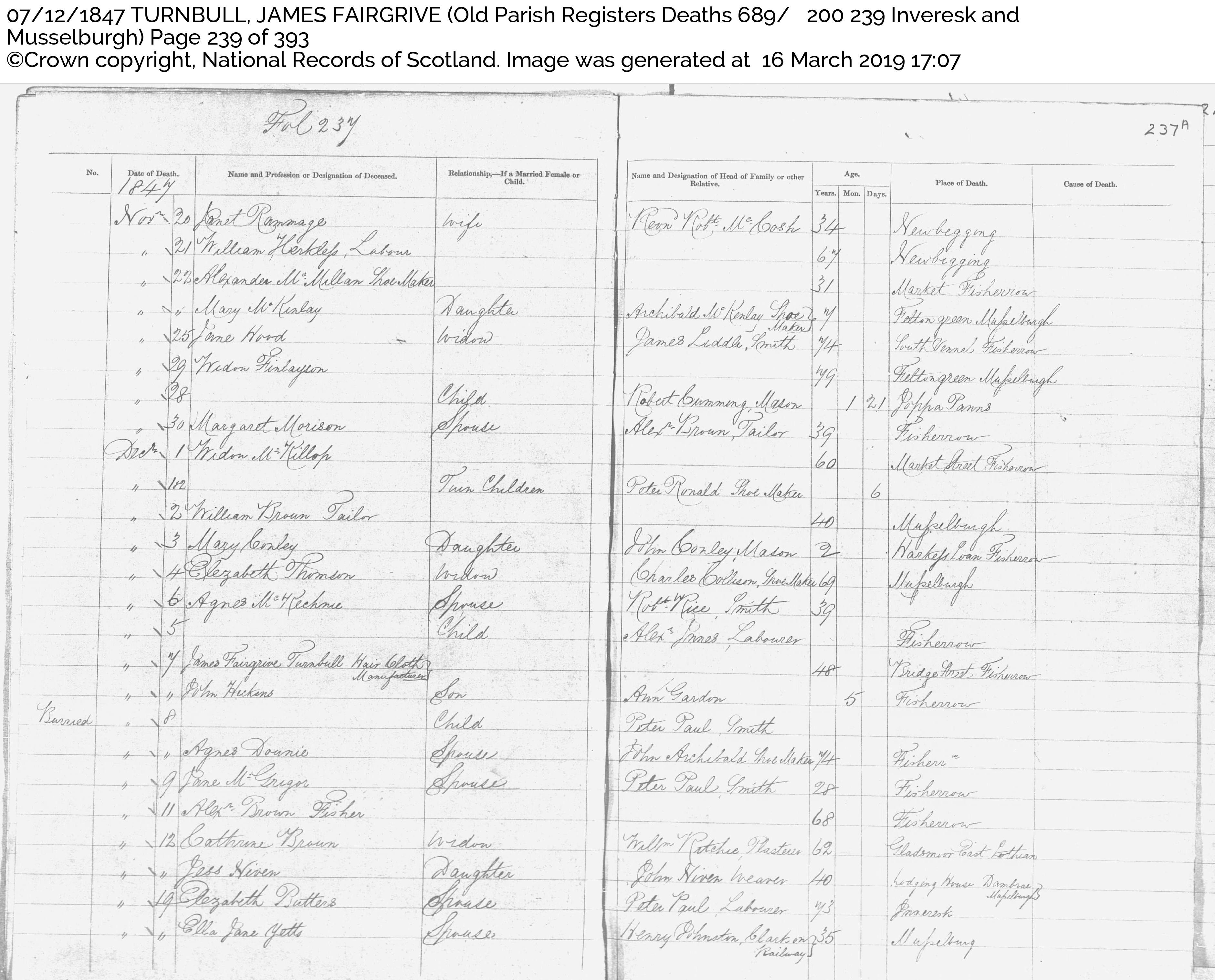 | Marriage | He married Mary Legat on 28 August 1845 in Inveresk with Musselburgh, Midlothian, Scotland. James Fairgrieve Turnbull was, age 46, Mary Legat was, age ~30. |