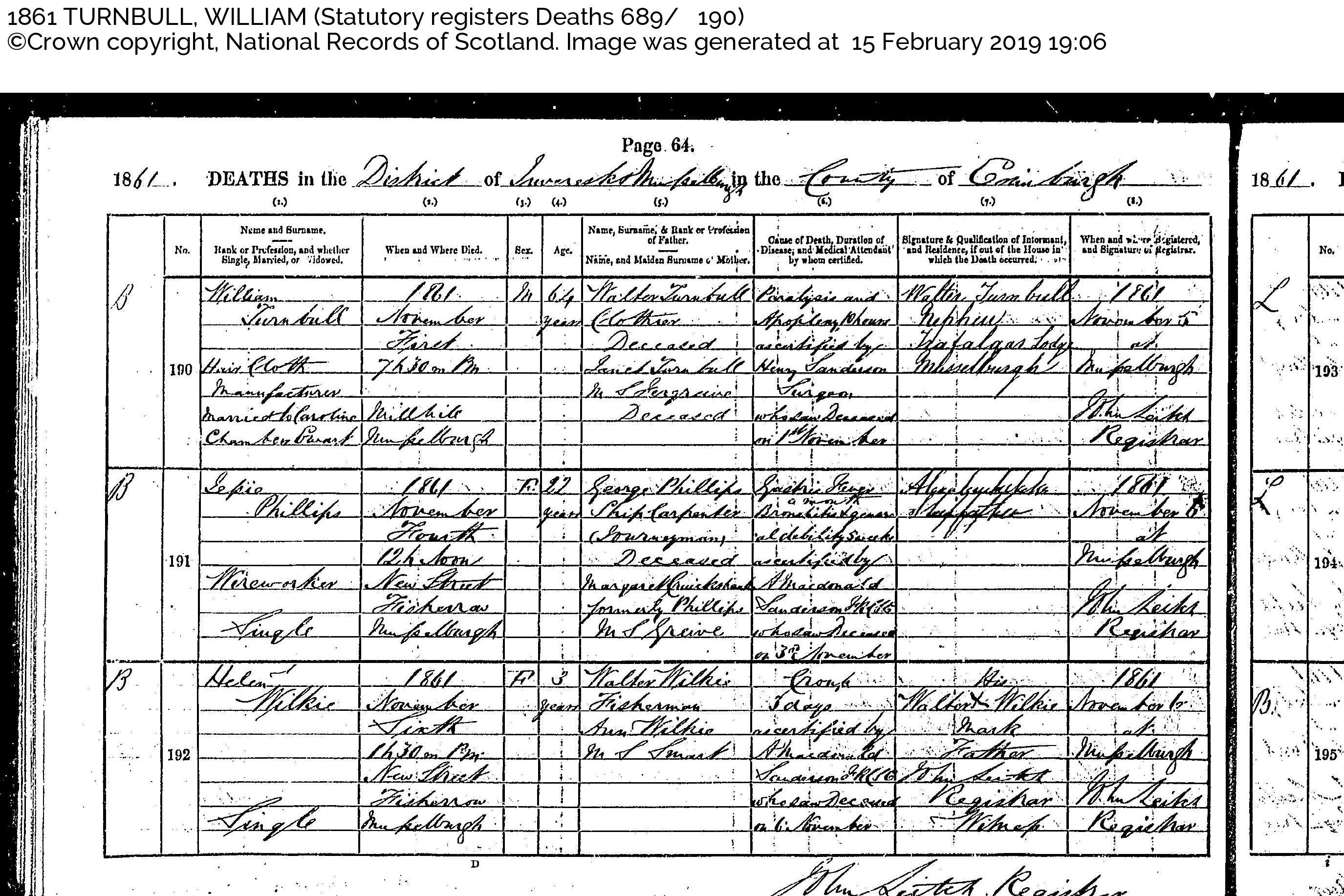| Residence | William Turnbull lived Relationship: Head in Inveresk, Midlothian, Scotland, in 1851.3 |