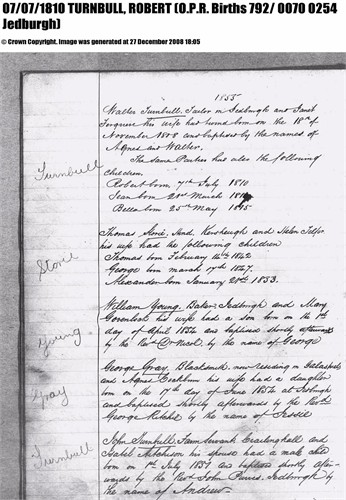 | Baptism | Walter Turnbull was baptized in Jedburgh, Roxburgh, Scotland.1 |