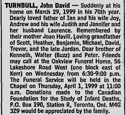 | Birth | John David Turnbull was born on 3 October 1929 in Toronto, Ontario, Canada. |