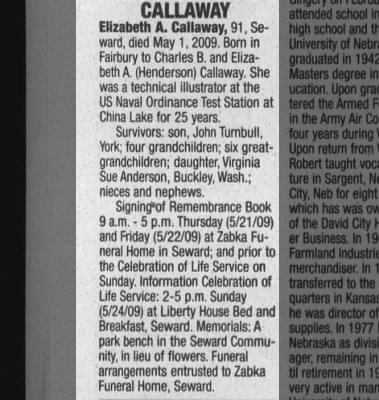 - [S3013] Ancestry.com, U.S., Obituary Collection, 1930-Current, Daily Independent; Publication Date: 21/ May/ 2009; Publication Place: Ridgecrest, California, USA; URL: http://www.ridgecrestca.com/obituaries/x313652064/Obit-Elizabeth-Agness-Callaway