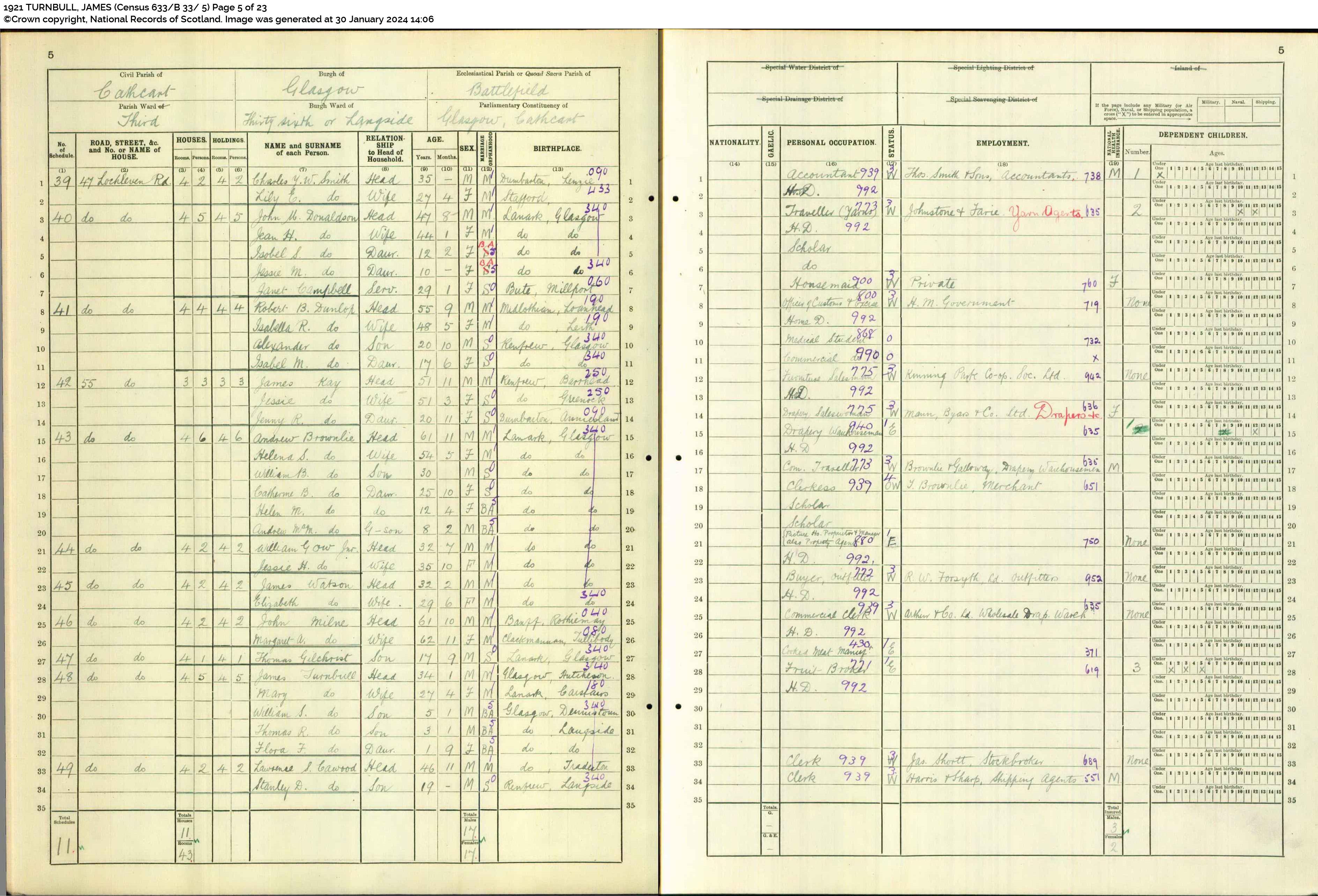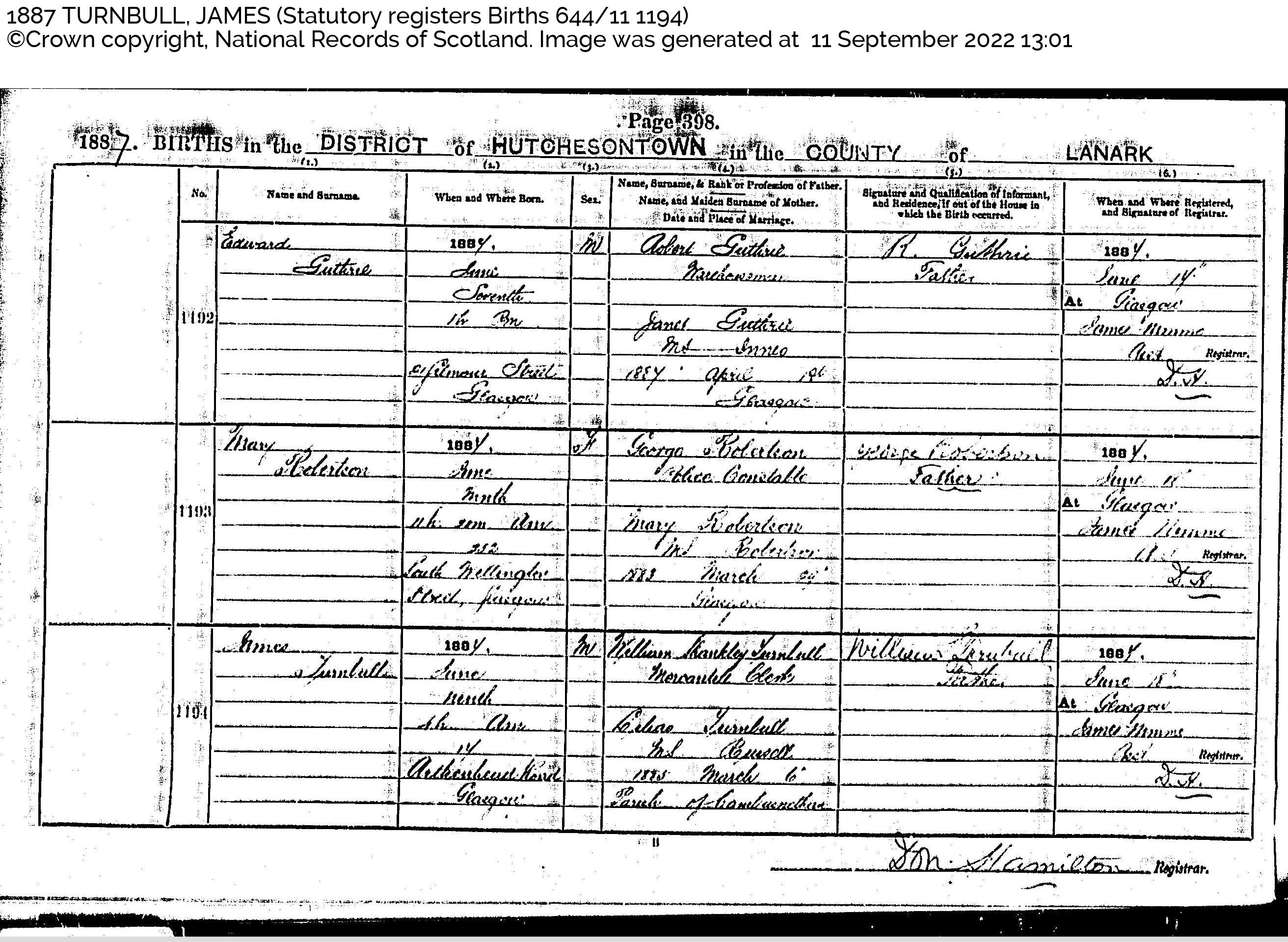 | Residence | James Turnbull lived Relation to Head of House: Son in Glasgow Govan, Lanarkshire, Scotland, in 1891.1 |