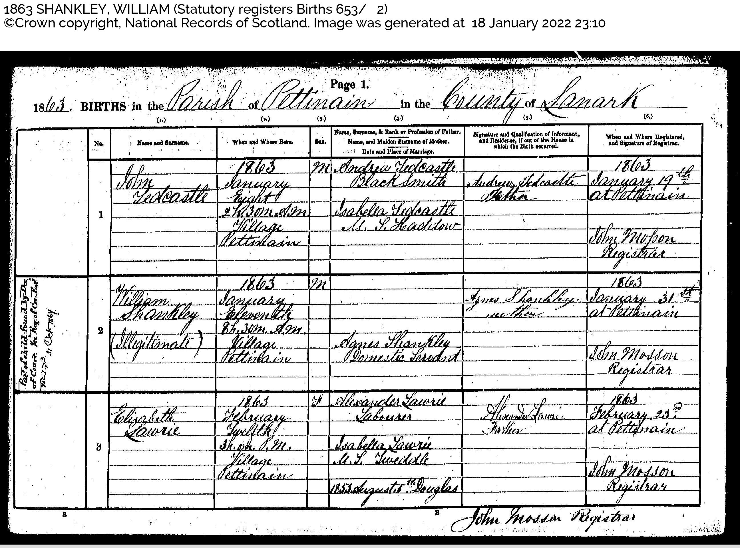 | Birth | Agnes Shankley was born on 24 August 1838 in Pettinain Parish, Lanarkshire.1,3,5,7,8 |