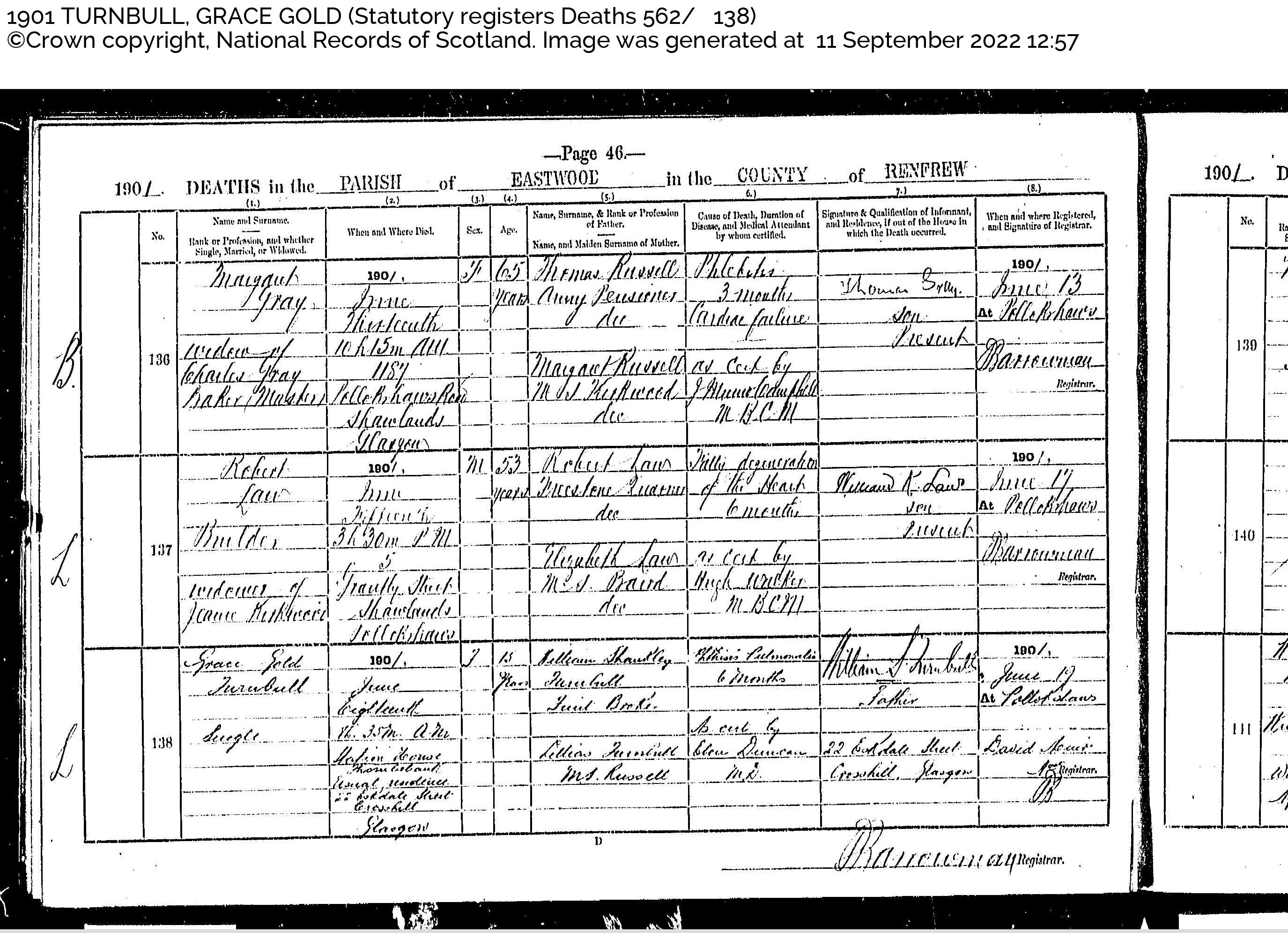- [S3029] Ancestry.com, 1901 Scotland Census, Parish: Glasgow Govan; ED: 89; Page: 11; Line: 4; Roll: CSSCT1901_312