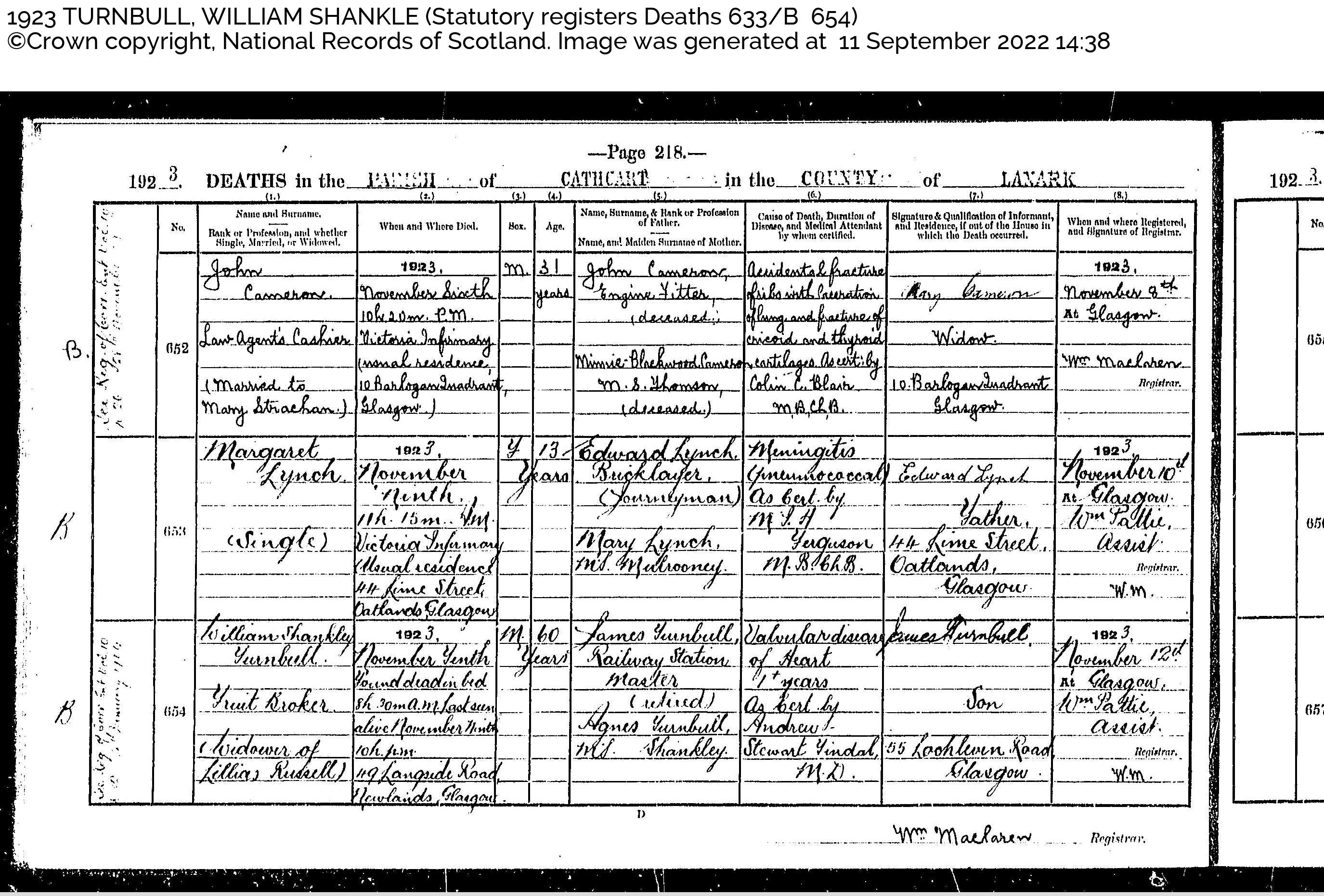 | Burial | William Shankley Turnbull was buried in East Renfrewshire, Scotland.2 |