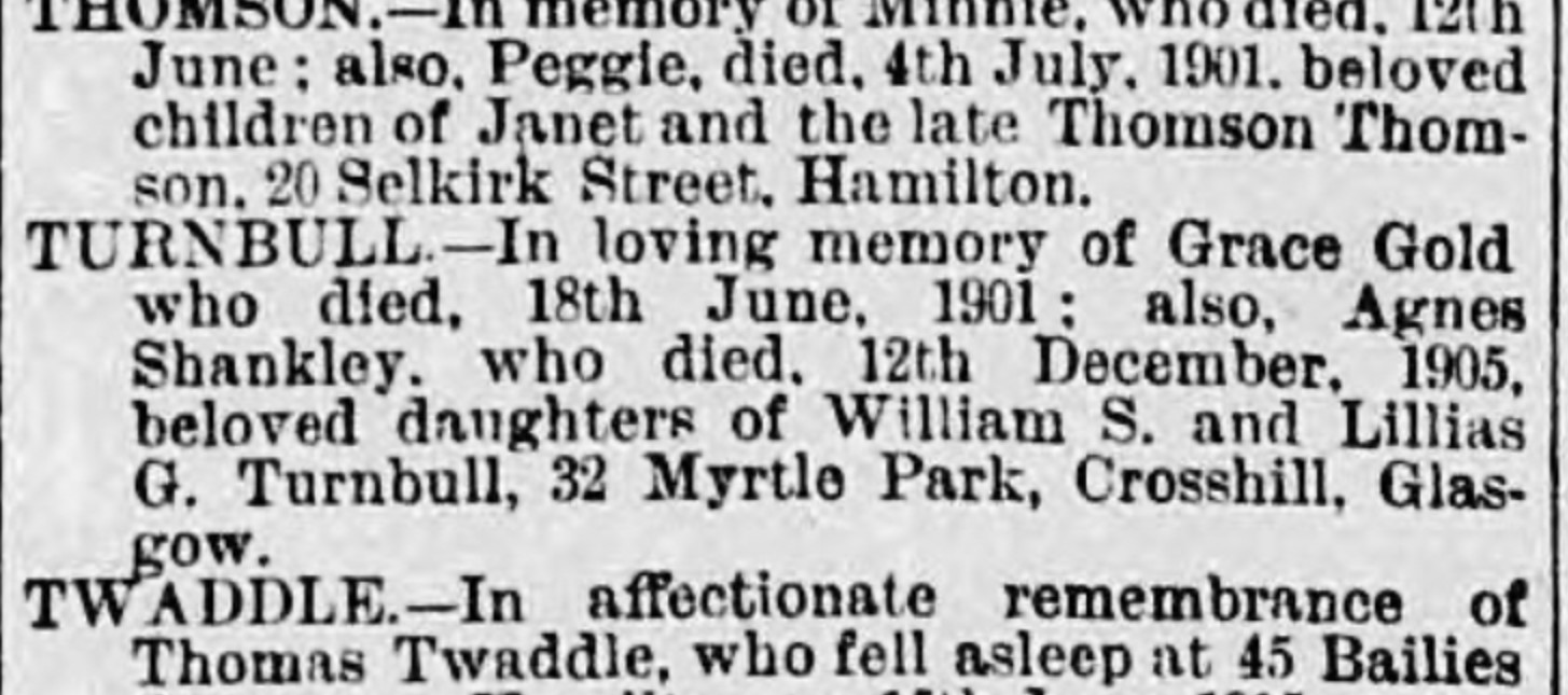 | Birth | Grace Gold Turnbull was born on 3 August 1885 in Golds Land, Waterloo, Lanarkshire, Strathclyde, Scotland, United Kingdom.1,2,3,4 |