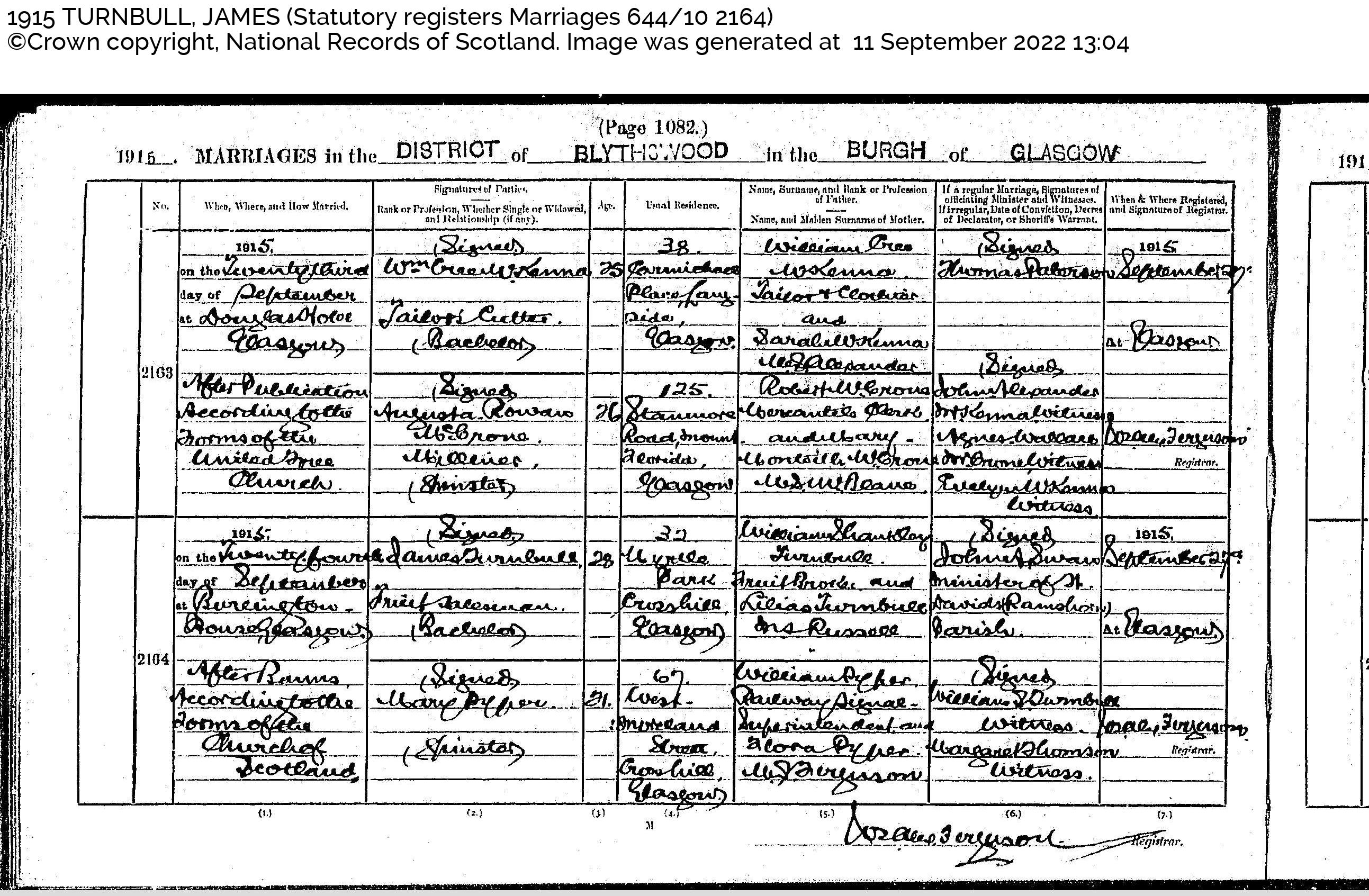 | Birth | James Turnbull, Fruit Merchant, was born about 1891 in Glasgow, Lanarkshire, Scotland.1,2,3,4,6 |