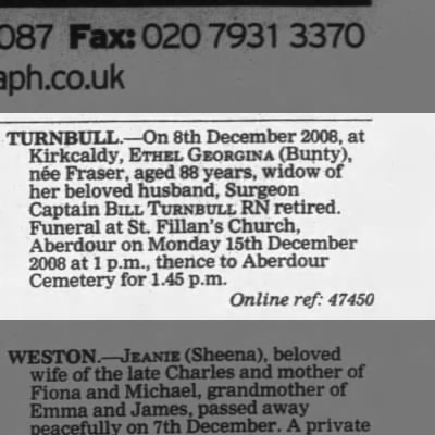 | Birth | Ethel Georgina "Bunty" Fraser was born in 1920 in Cathcart, Glasgow, Lanarkshire, Scotland. |