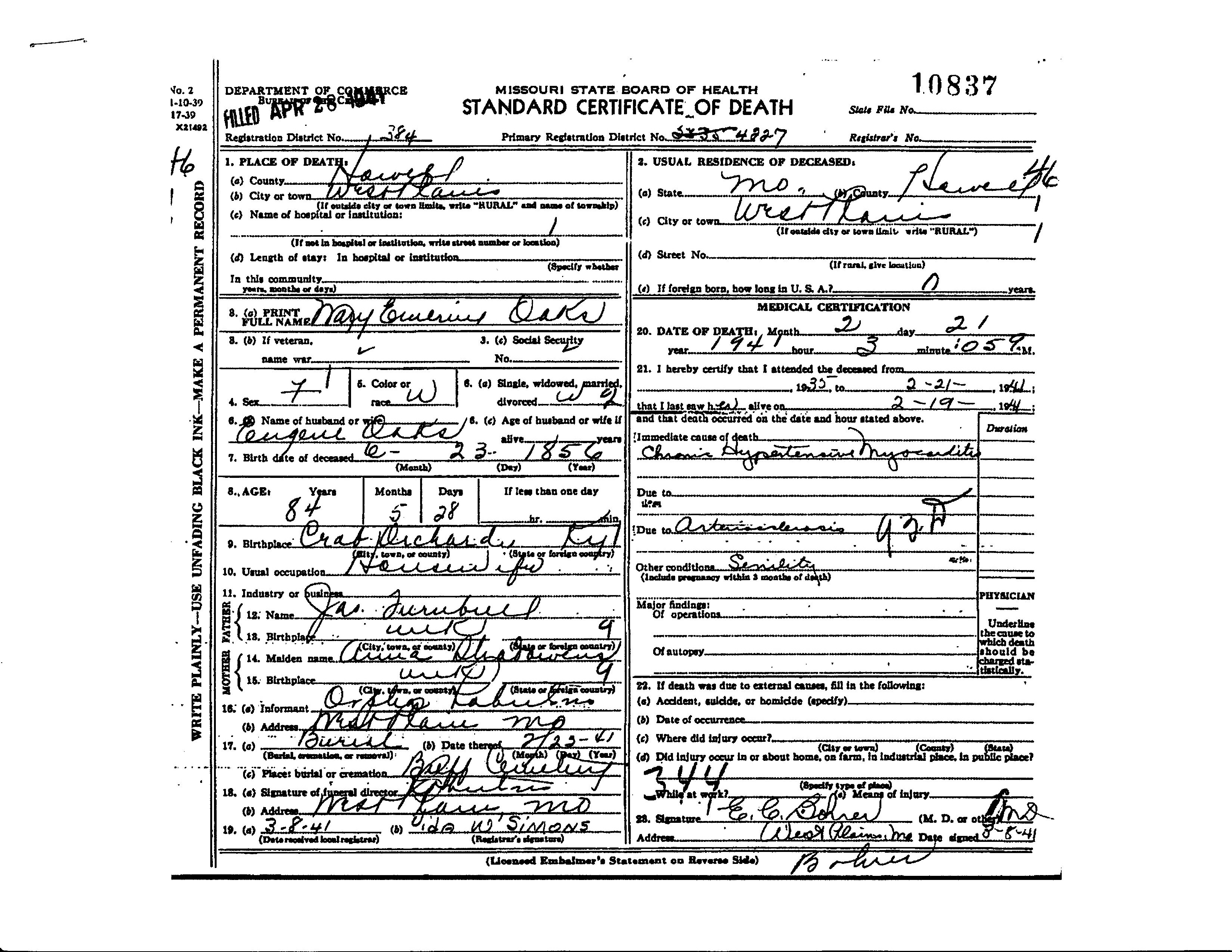 Mary E Oaks Death Cert
