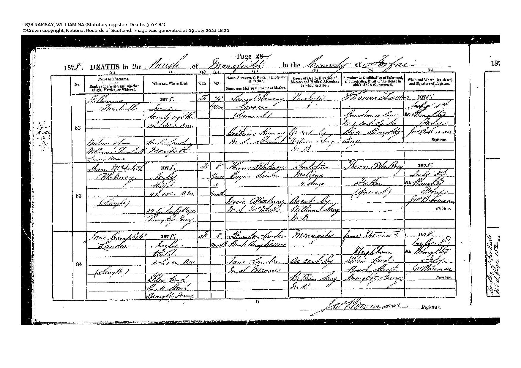 | Death | She died on 28 June 1878 at age ~76 in Monifieth, Angus, Scotland.6,7 |