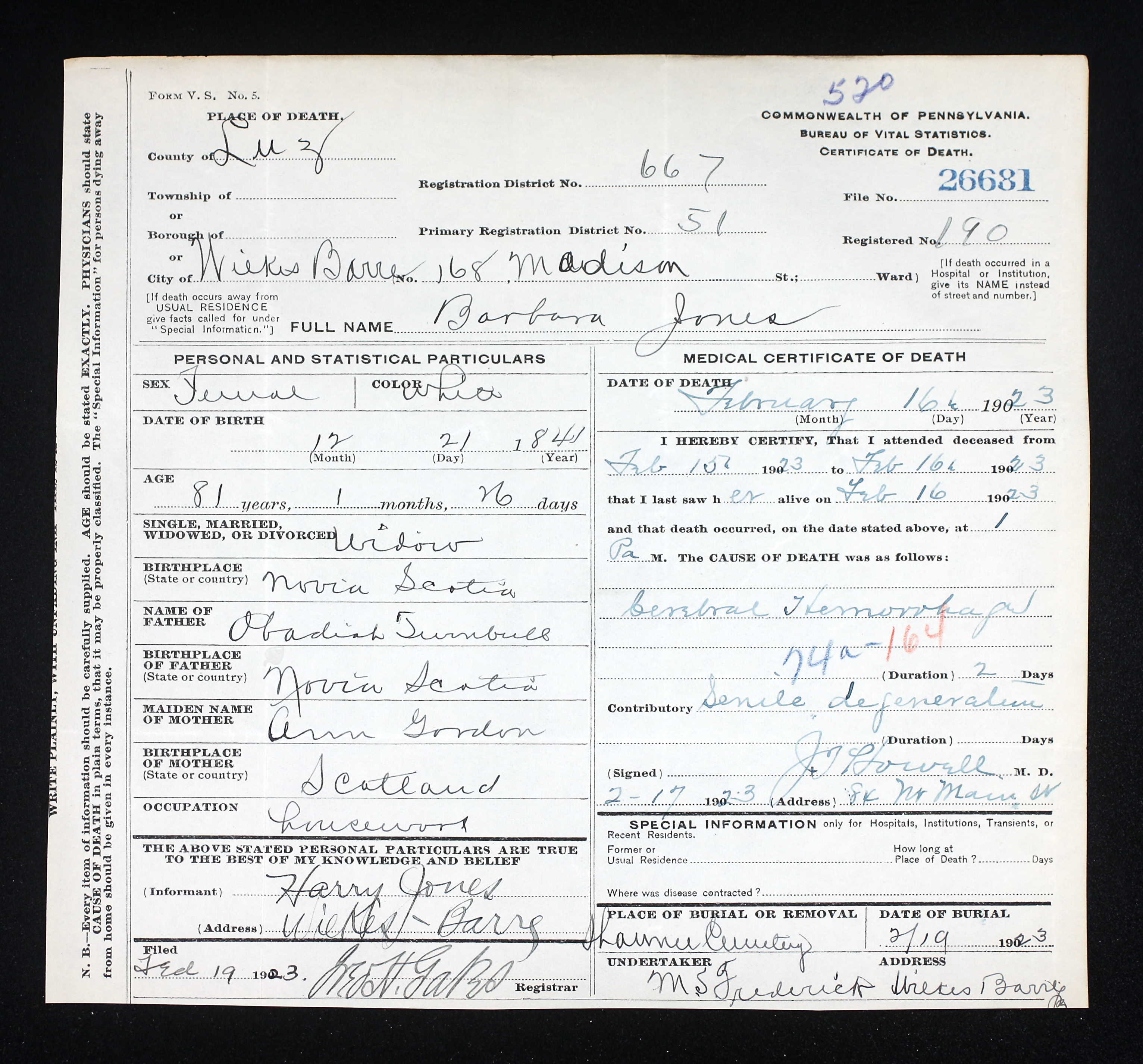 | Death | She died on 16 February 1923 at age 81 in Wilkes-Barre, Luzerne County, Pennsylvania, United States of America.1,2 |