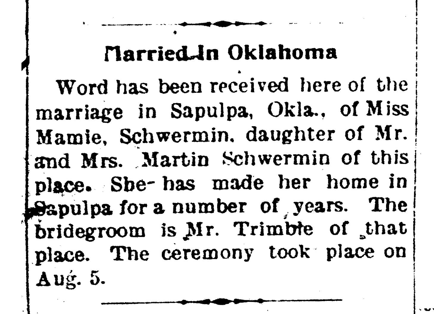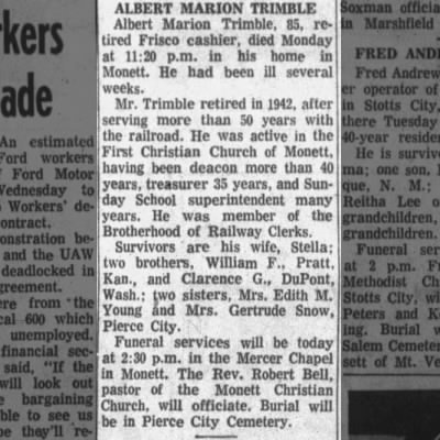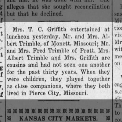 - [S1910] Ancestry.com, Missouri, U.S., Newspapers.com™ Stories and Events Index, 1800's-current (Name: Ancestry.com Operations Inc; Location: Lehi, UT, USA; Date: 2023;), Lawrence Chieftain; Publication Date: 3 Oct 1901; Publication Place: Mount Vernon, Missouri, USA; URL: https://www.newspapers.com/image/335461960/?article=bf328c5e-c316-4ca8-9298-e7f0a4a36a00&xid=5580&terms=Mrs._Ethel_Trimble