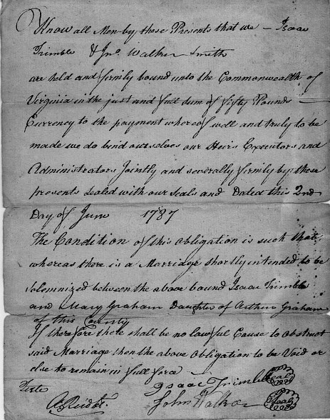 | Marriage | She married Isaac Trimble on 14 June 1787 in Rockridge, Virginia, United States. Mary Polly Graham was, age ~22, Isaac Trimble was, age 31.1,2,3 |