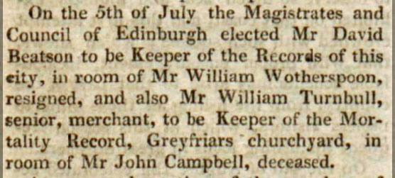 Appointment to be Keeper of the Mortality Record, Greyfriars Churchyard - The Scots Magazine