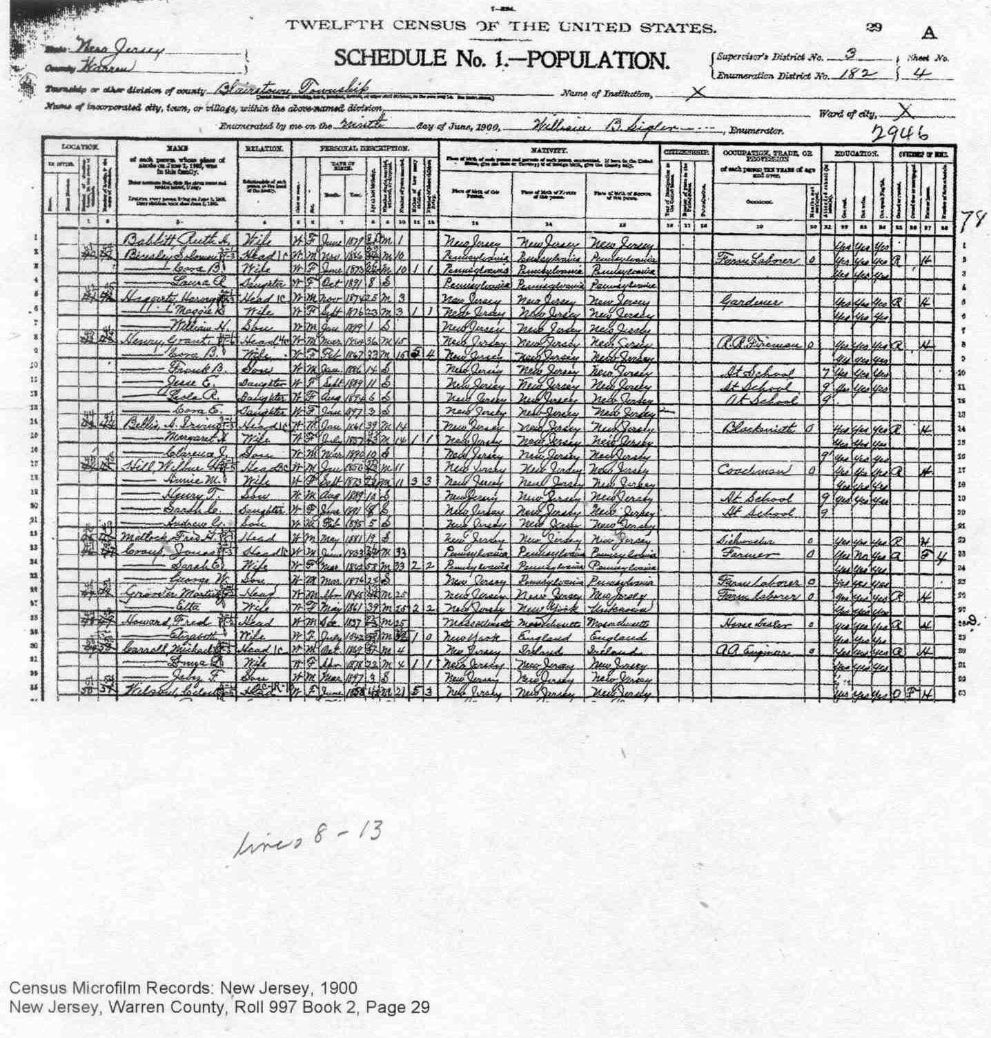 1900 Census Blairstown Township, Warren, New Jersey, USA