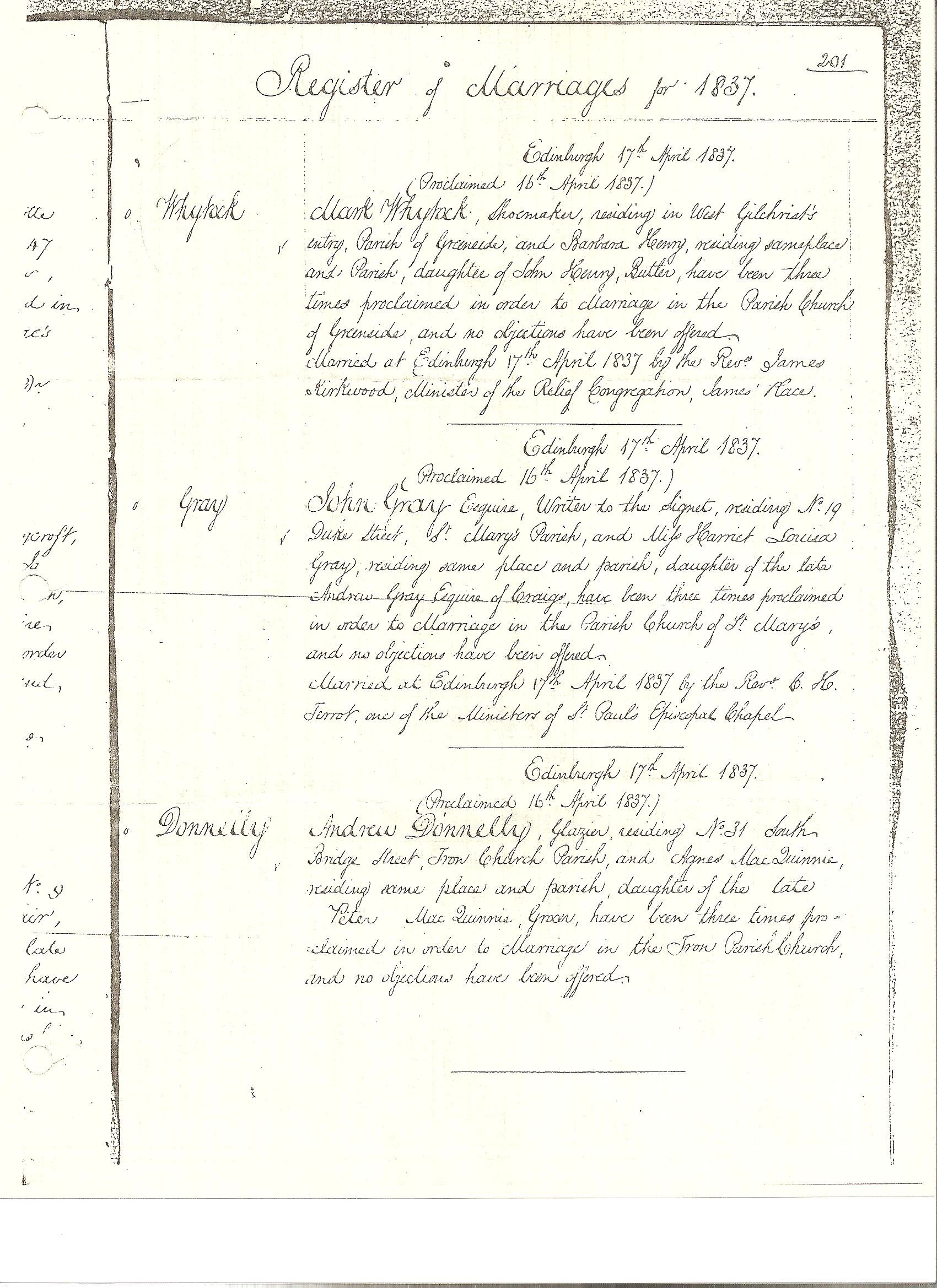 | Marriage | She married Mark Whytock on 17 April 1837 in Edinburgh, Edinburghshire, Scotland, United Kingdom. Barbara Henry was, age ~20, Mark Whytock was, age 29. Edinburgh, Midlothian, Scotland5,1 |