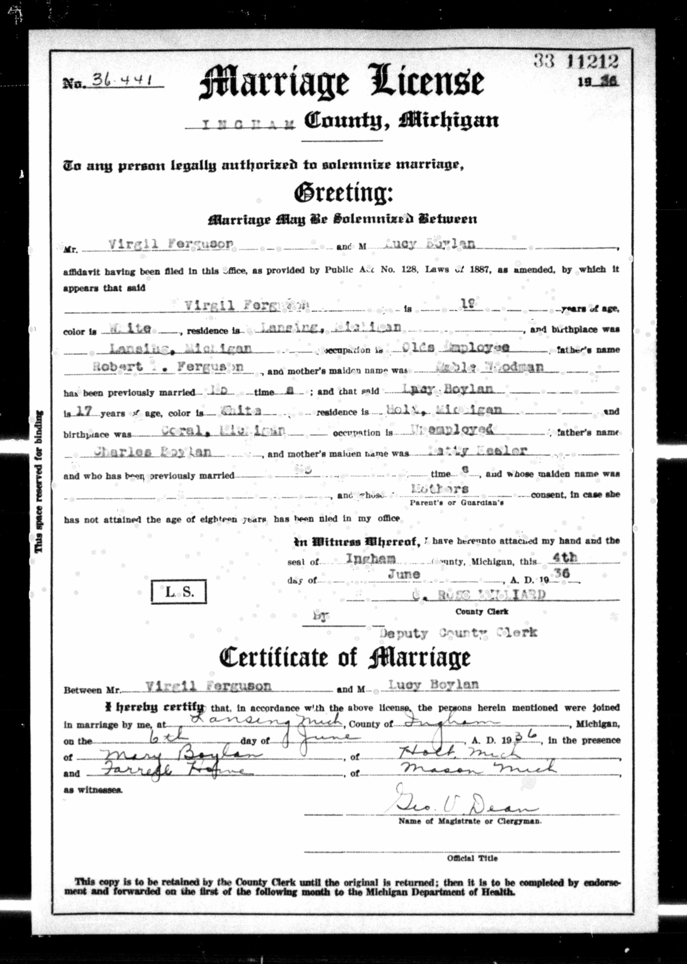 | Marriage | She married Virgil Dale (Trumble) Ferguson on 6 June 1936 in Lansing, Mich, Ingham, Michigan, USA. Lucy Boylan was, age 17, Virgil Dale (Trumble) Ferguson was, age 19. |