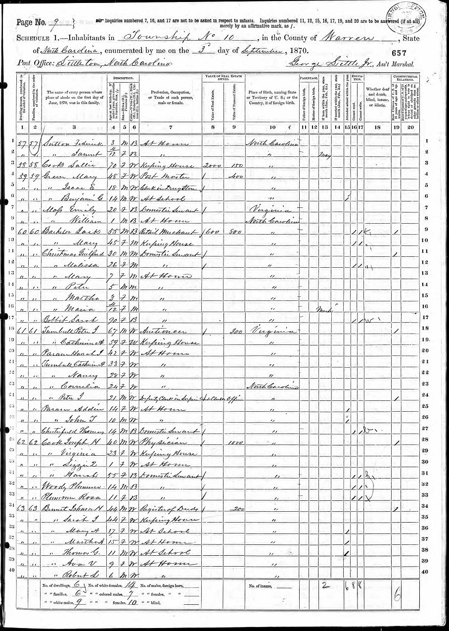 - [S1132] Ancestry.com, 1870 United States Federal Census (Name: Ancestry.com Operations, Inc.; Location: Provo, UT, USA; Date: 2009;), Year: 1870; Census Place: Township 10, Warren, North Carolina; Roll: M593_1164; Page: 657A