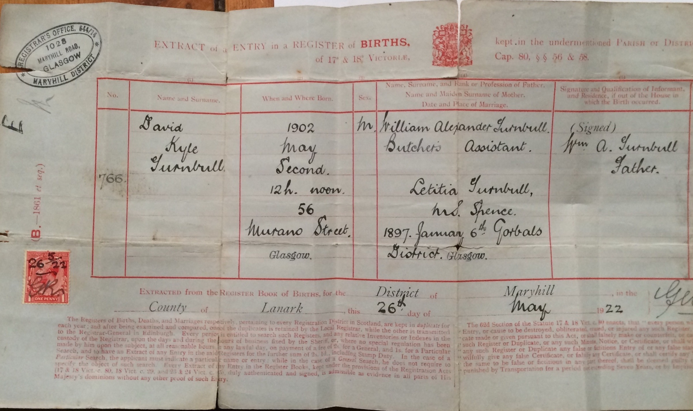 | Birth | David Kyle Turnbull was born on 2 May 1902 in Glasgow, Lanarkshire, Scotland.1 |