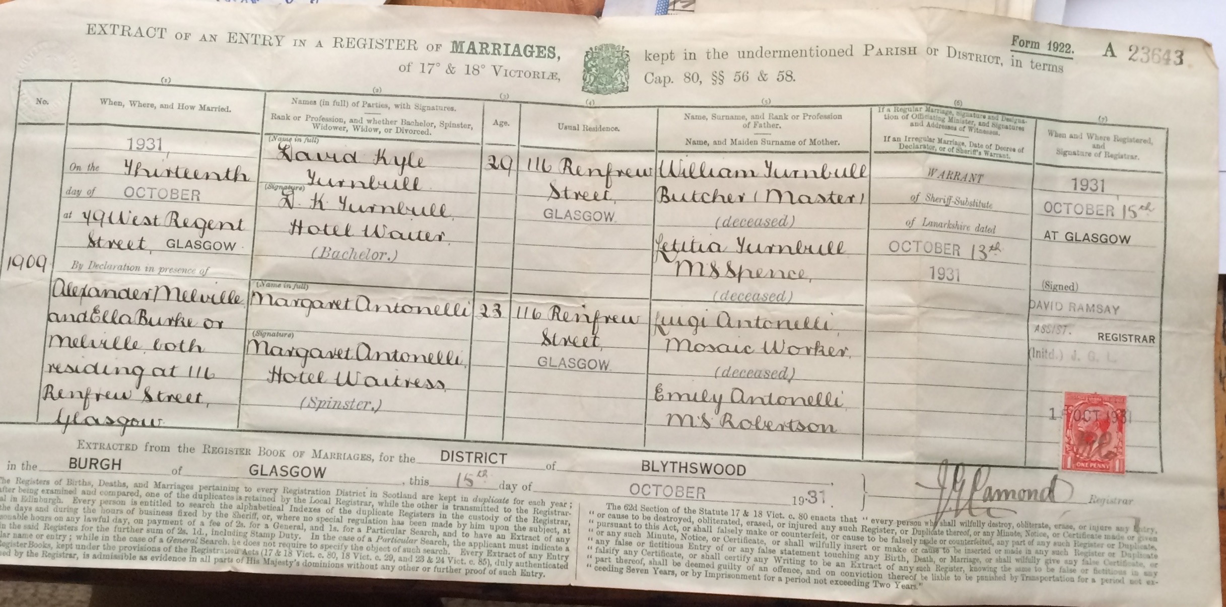 | Marriage | He married Margaret Howden Antonelli on 13 October 1931 in Glasgow, Lanarkshire, Scotland. David Kyle Turnbull was, age 29, Margaret Howden Antonelli was, age 23. |