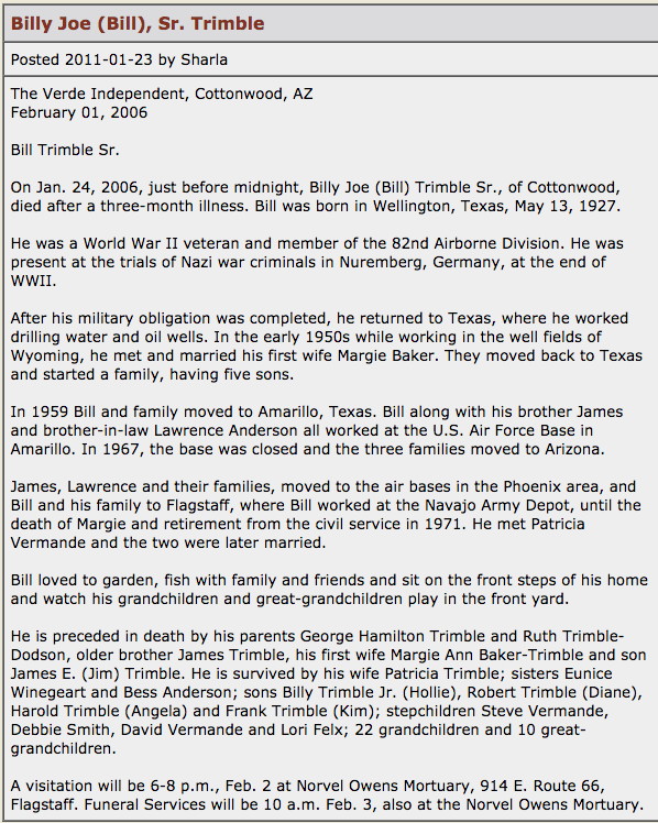 | Burial | Billy Joe Trimble, Sr, was buried in Flagstaff, Coconino County, Arizona, United States of America.5 |