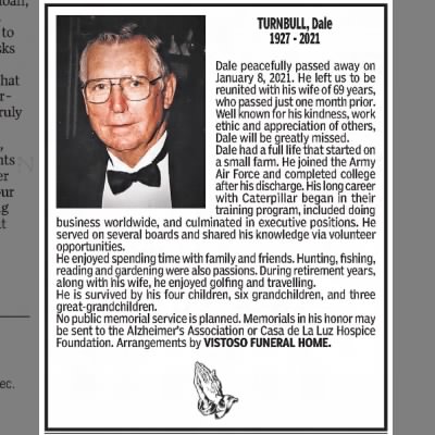 . - [S1280] Ancestry.com, U.S., Obituary Collection, 1930-Current, Arizona Daily Star; Publication Date: 2021; Publication Place: Tucson, USA; URL: https://www.legacy.com/us/obituaries/tucson/name/dale-turnbull-obituary?pid=197478765, See newspaper information provided with each entry.