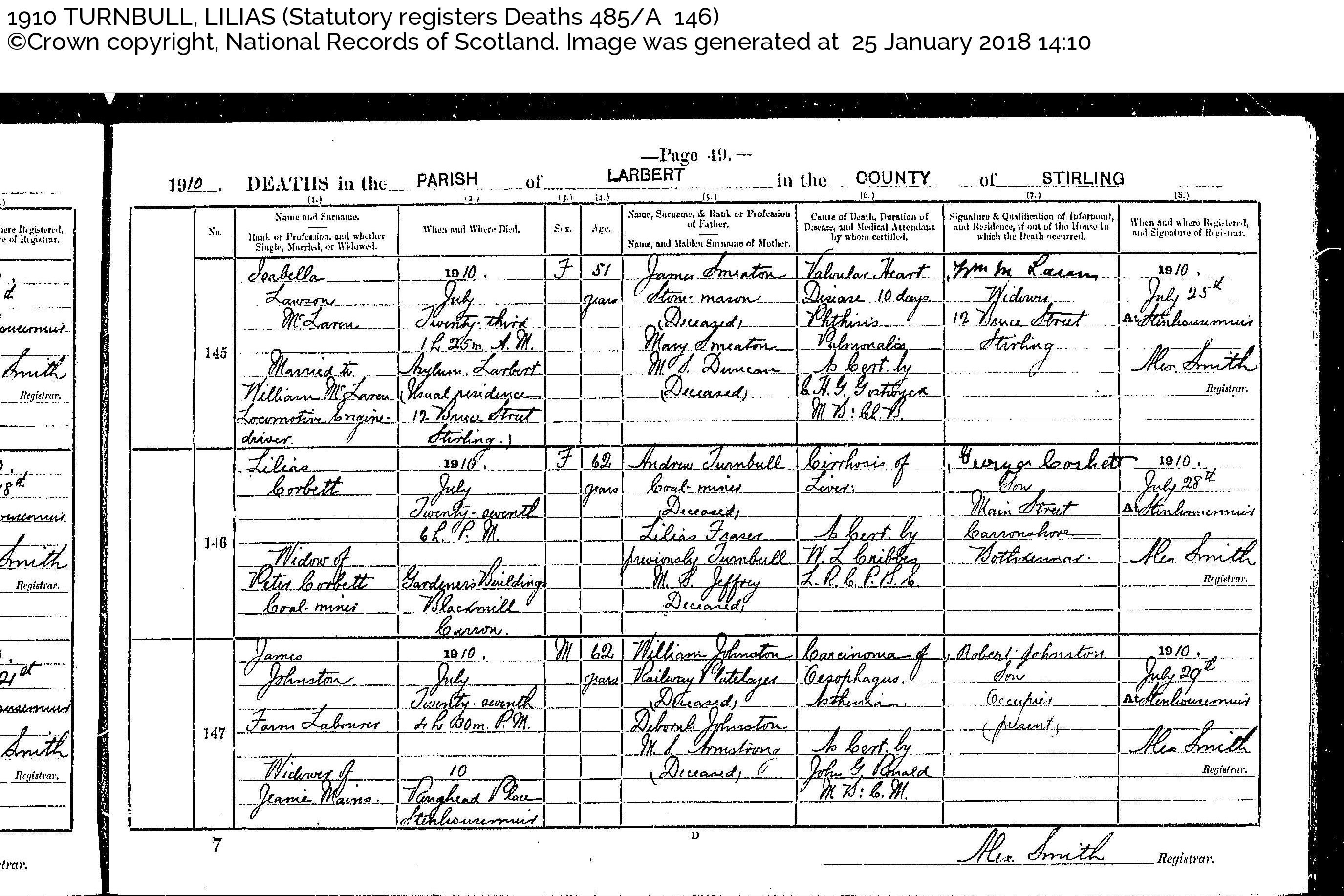 - [S3029] Ancestry.com, 1901 Scotland Census, Parish: Larbert; ED: 9; Page: 7; Line: 10; Roll: CSSCT1901_161