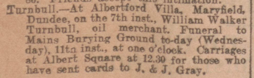 | Death | He died Occupation: Oil merchant on 7 December 1901 at age 55 in Broughty Ferry, Angus, Scotland.8 |