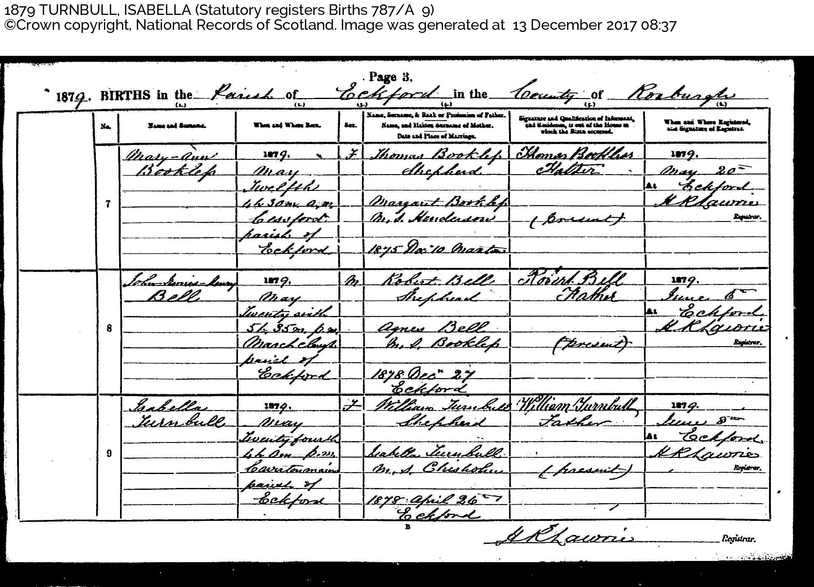 | Marriage | He married Isabella Chisholm on 26 April 1878 in Eckford, Roxburghshire, Scotland. William Turnbull, Snr, was, age 23, Isabella Chisholm was, age 21. |