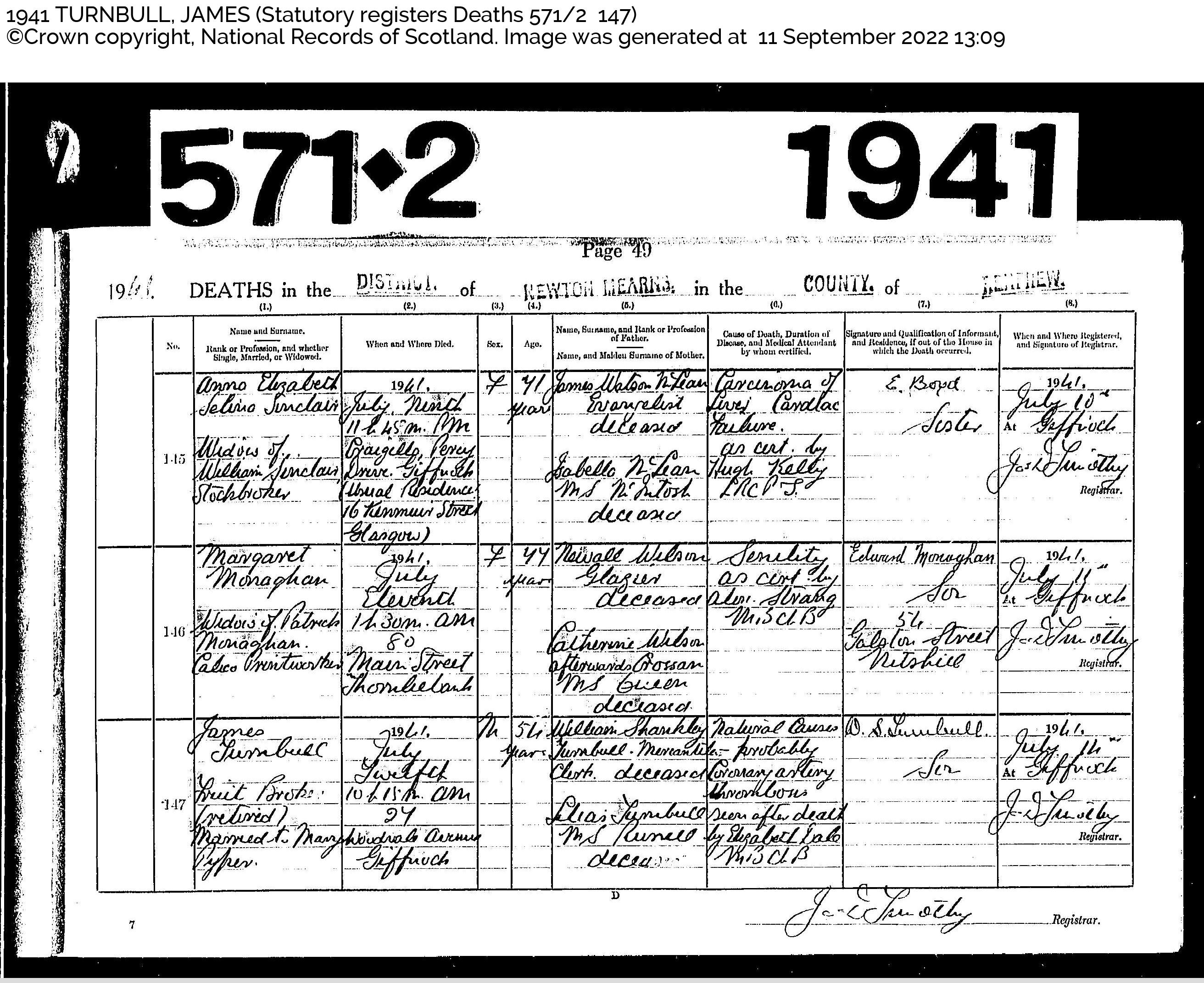 | Birth | James Turnbull was born on 9 June 1887 in 17, Aitkenhead Road, Hutchesontown, Glasgow, Lanarkshire, Scotland.1,3 |