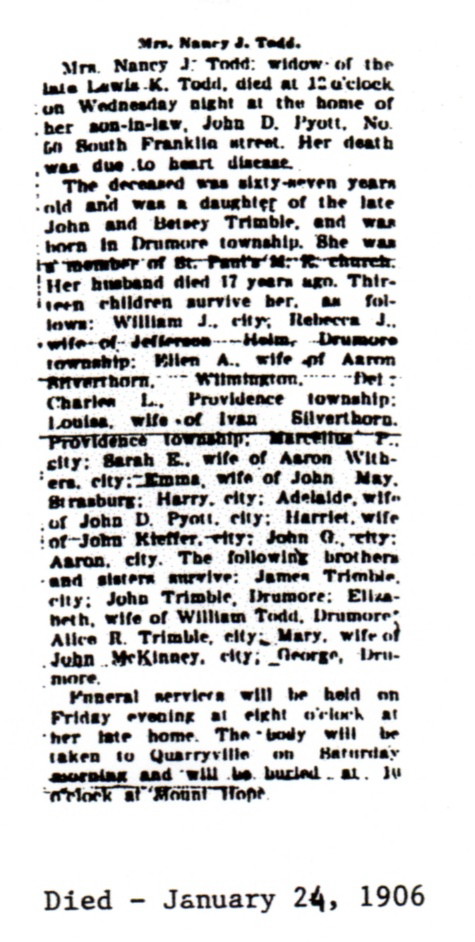 | Burial | Nancy Jane Trimble was buried in Quarryville, Lancaster County, Pennsylvania, United States of America.5 |